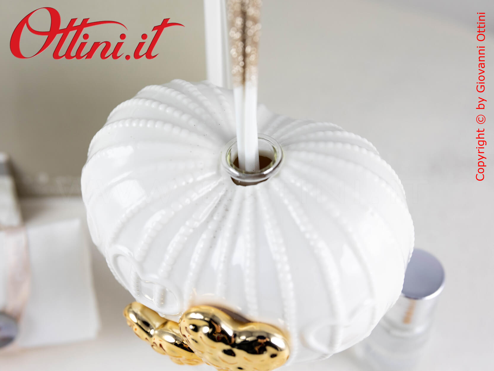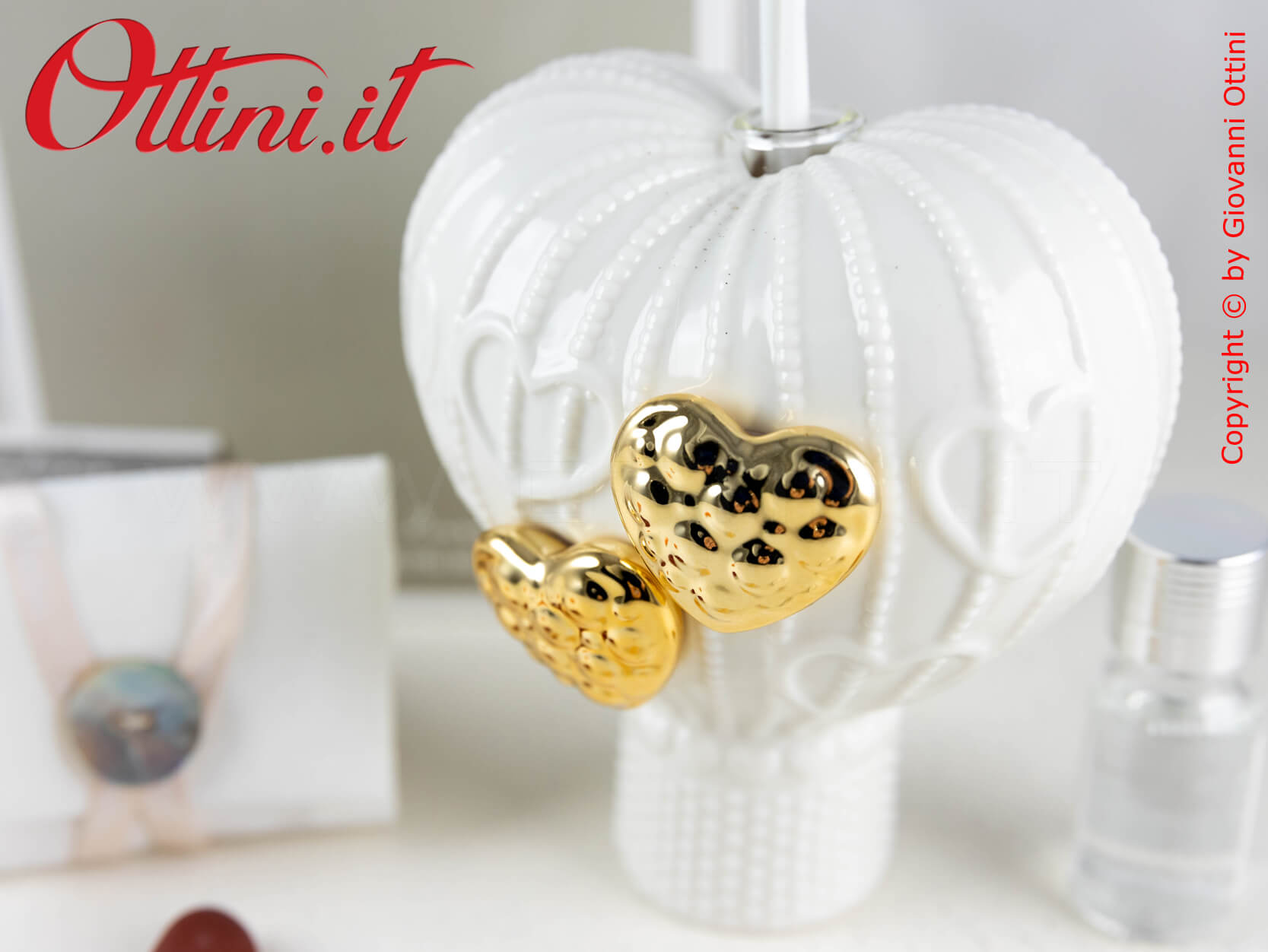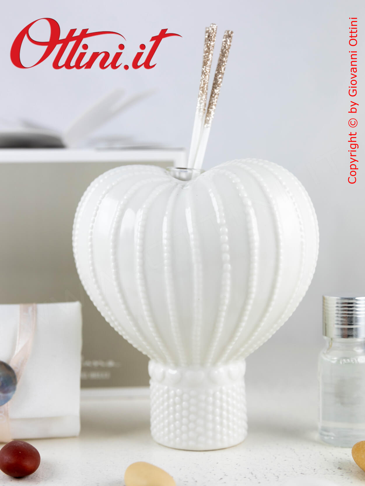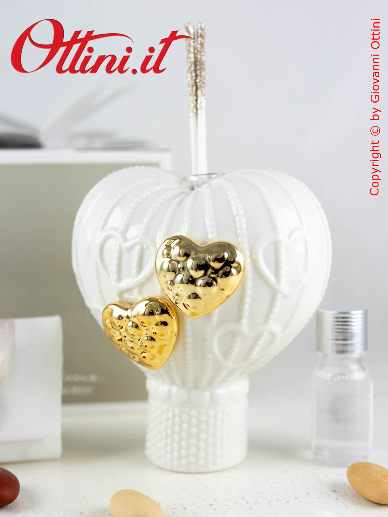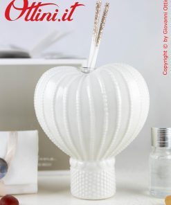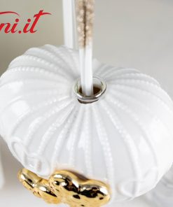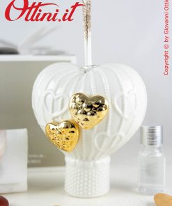 Sognatori con la mente tra le nuvole alla ricerca di nuove mete o viaggiatori di questo mondo bellissimo? Ecco una bomboniera che vi può rappresentare. Una bellissima mongolfiera realizzata in finissima porcellana bianca smaltata con due cuori dorati meravigliosi. Questo profumatore per ambienti è anche un componente d’arredo elegantissimo, utile e bello da vedere. Ovviamente è compreso il kit essenza, composto dal flaconcino con il profumo e i bastoncini diffusore con finitura glitterata.