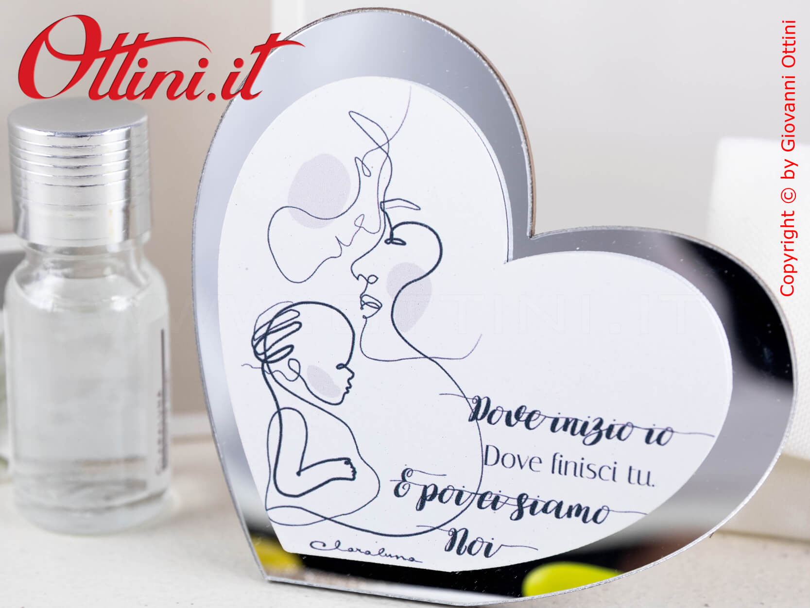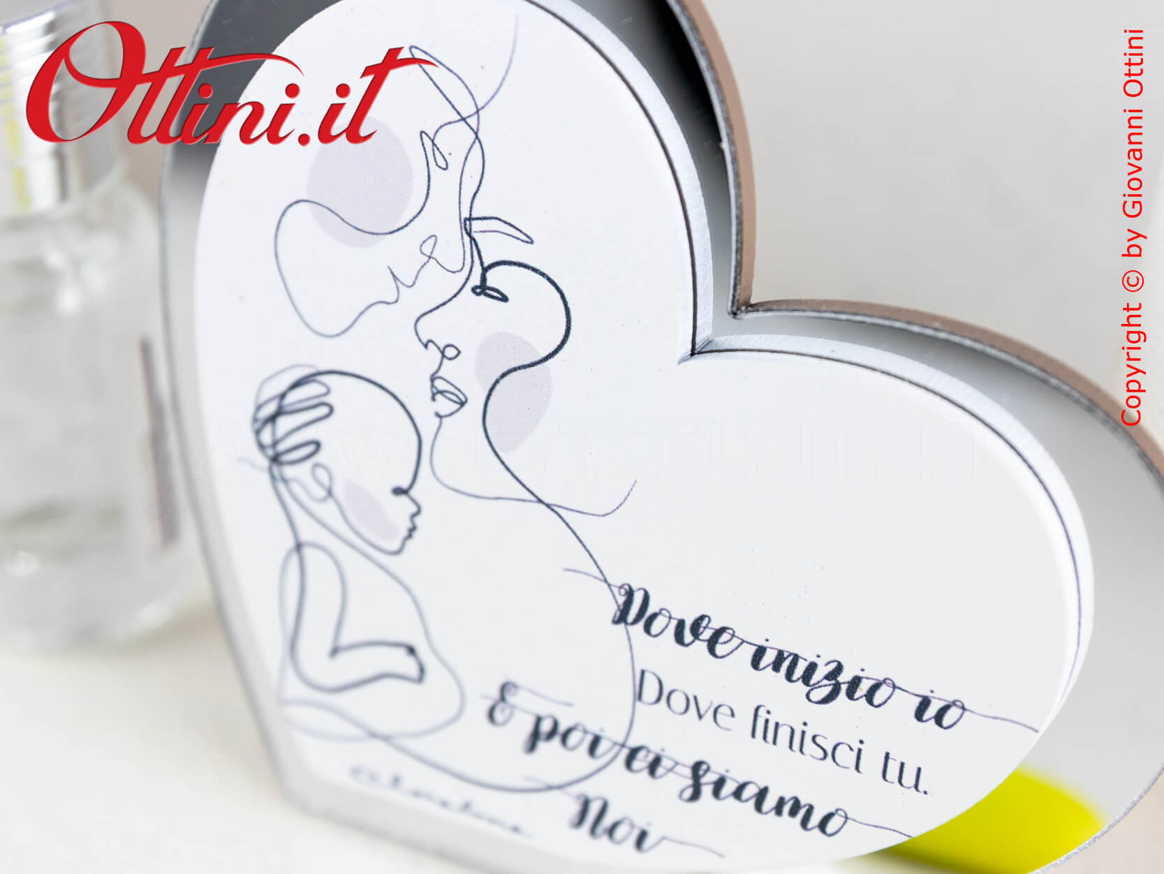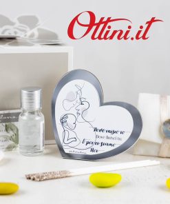 Elegante profumatore a forma di cuore realizzato su base acrilica a specchio e decoro stilizzato di una famiglia e un aneddoto. È completo del kit essenza, composto dai bastoncini diffusori glitterati e il flaconcino con il profumo.