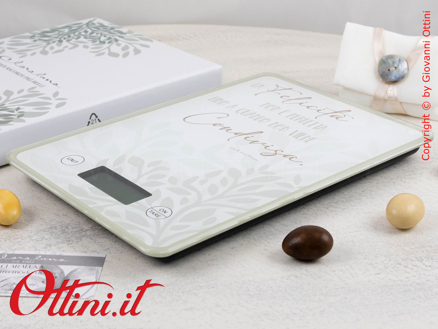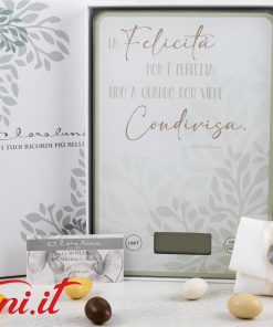 Per tutti gli aspiranti Chef di famiglia arriva una proposta molto interessante di Claraluna: la Bilancia da cucina con decoro a forma di cuore Verde. Gli amanti delle cose utili e funzionali, anche eleganti, soprattutto se destinate all’uso quotidiano, sono in continua crescita e cercano soluzioni adatte alle proprie esigenze. Claraluna ha puntato molto su questa linea di articoli, cercando soluzioni “nuove” nel contesto della regalistica di eventi, che sia un matrimonio o un anniversario, e le ha personalizzate con frasi e aneddoti di carattere emozionale. “La Felicità non è perfetta fino a quando non viene condivisa” è il messaggio stampato sotto al vetro di appoggio. Funziona con una batteria CR2032 (le classiche a pastiglia che si usano anche per i telecomandi) NON inclusa (la normativa europea UE2023/1542 sulle batterie ha di fatto creato un ostacolo all’importazione di prodotti con batterie incluse).