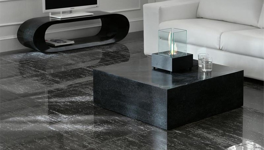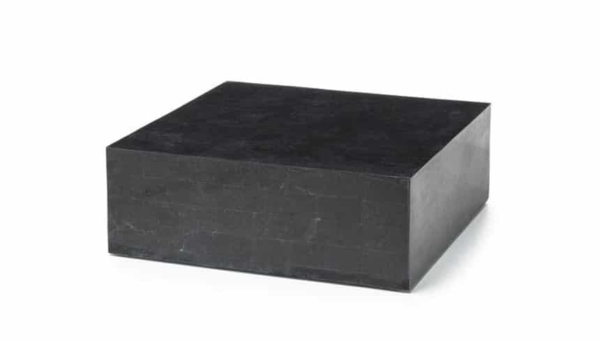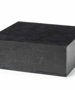 Tavolino da salotto dallo stile moderno ed elegante completamente realizzato in compensato marino ricoperto da tasselli di pietra fossile con finitura Black Stone.