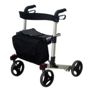Deambulatore rollator pieghevole dotato di 4 ruote da 200 mm di diametro, le due posteriori fisse le le due anteriori possono essere fisse o piroettanti, struttura in alluminio anodizzato con design moderno, sistema frenante sulle due ruote posteriori con azione dalle maniglie e freno di stazionamento, impugnature regolabili in altezza, ampio e resistente sedile in tela con appoggio lombare ed una borsa portaoggetti. Si può piegare sino a raggiungere delle dimensioni molto ridotte.