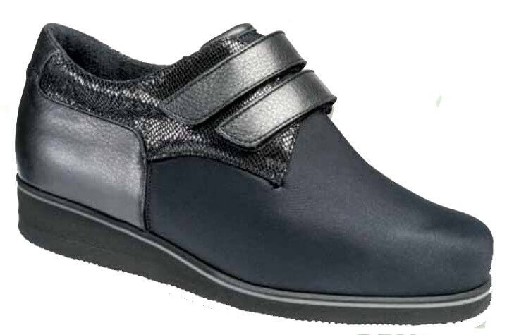 Scarpe da donna per piede reumatico. Scarpe Automodellanti. Indicate per piede con o senza deformità, alluce valgo, dita a martello, per metatarsalgie, artriti e artrosi. Materiale: Lastex Nero più Viperina nero più vitello nero. Misure disponibili dal 35 al 42. Dotate di plantare estraibile, suola in micro lavorabile.